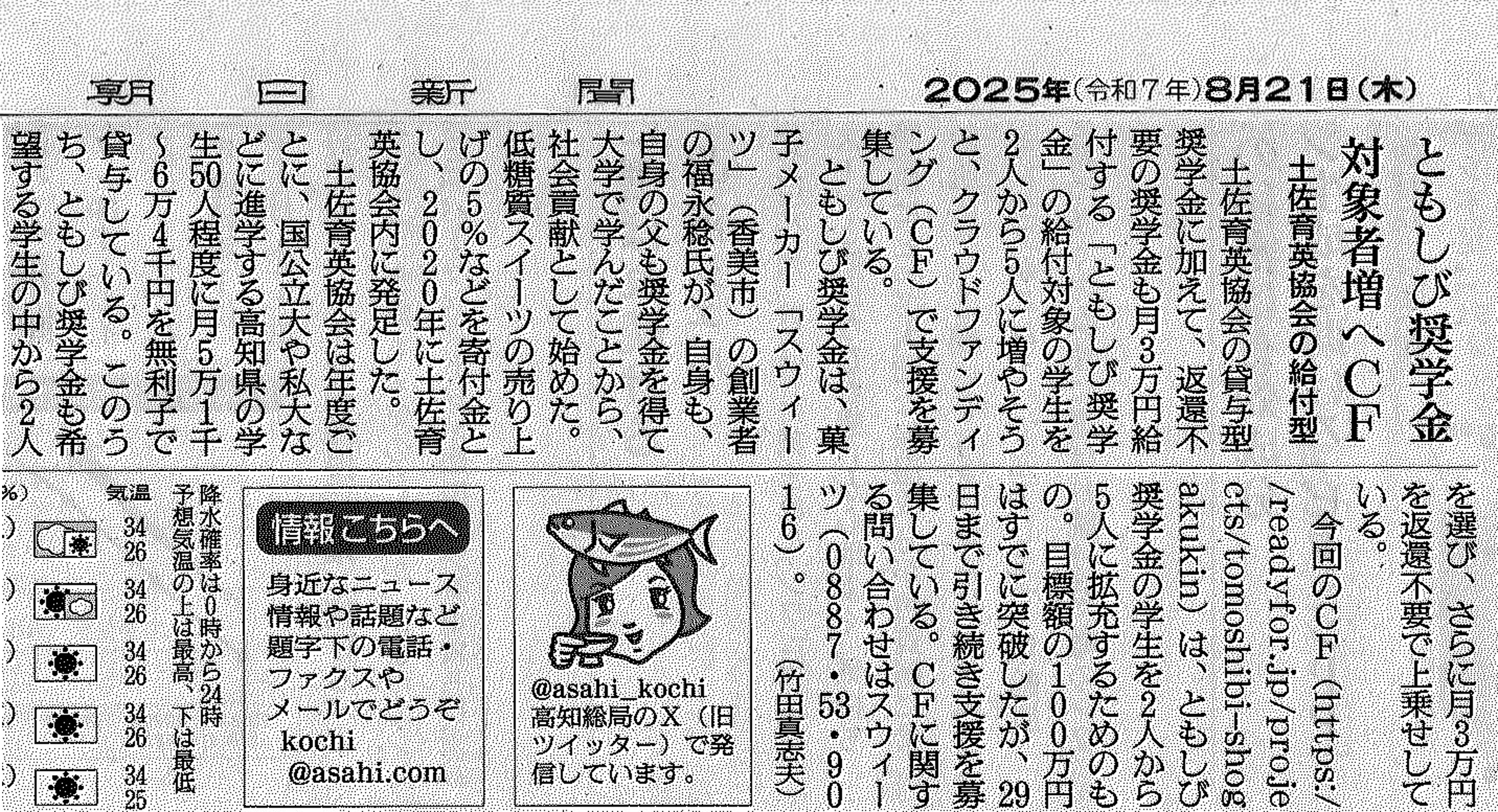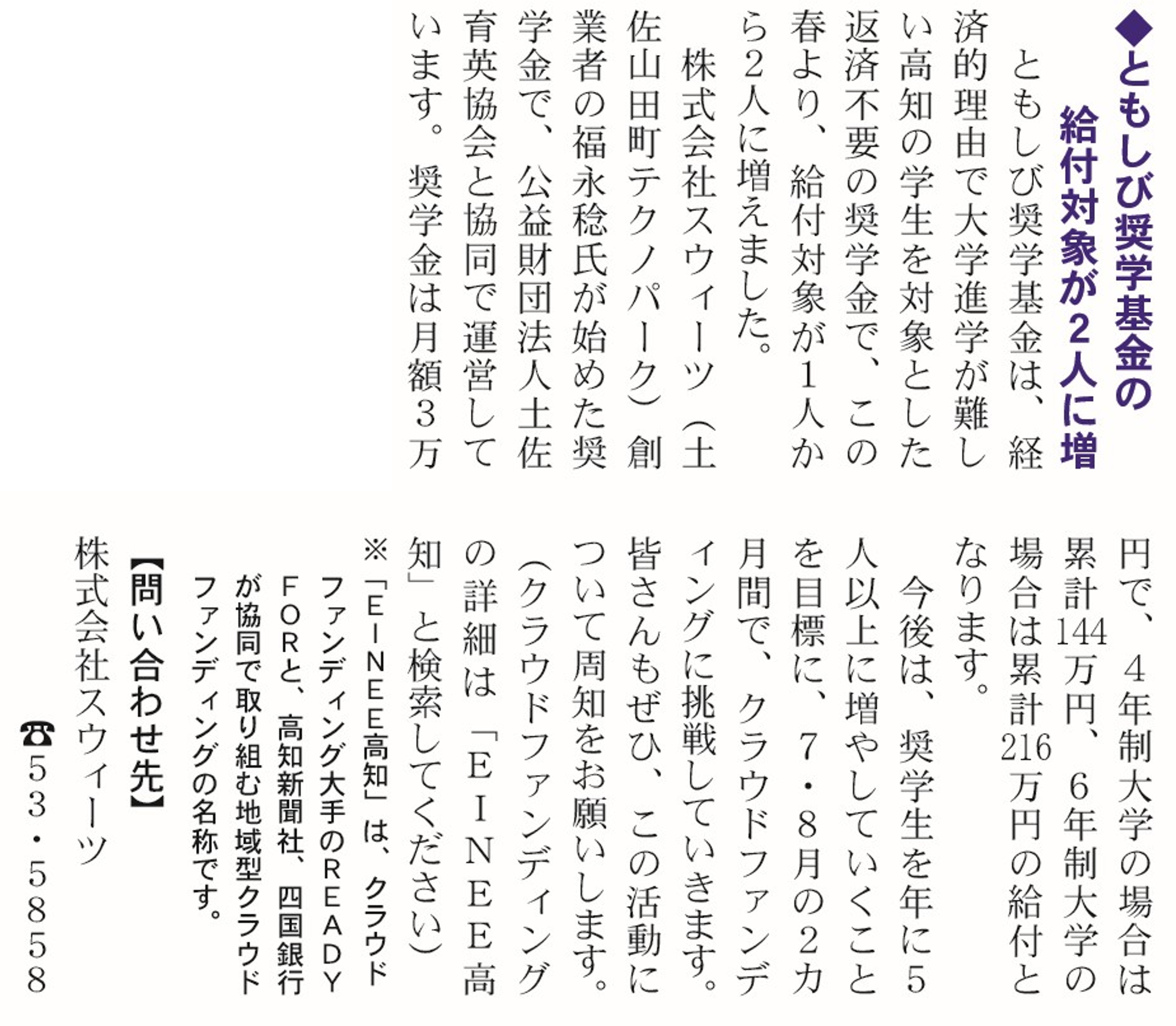 高知県給付型奨学金「県夢・志チャレンジ基金」が2023年度募集(2024年度分の13人)分で終了するという記事の中で、県内唯一の給付型奨学金ということで「ともしび奨学基金」が紹介されました。